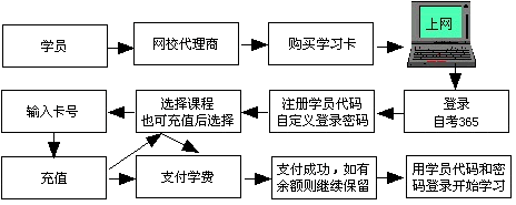 新学员使用流程:学员在购买学习卡以后,刮开学习卡上的卡号覆盖层,然后登录到自考365,注册学员代码和密码、选择课程(也可以在充值后选择)、输入学习卡号(如有多张可依次输入)、进行充值、点击"学习卡支付"划拨课程费用、等确认支付成功后,用新的学员代码和密码登录网校点击所报课程开始学习。